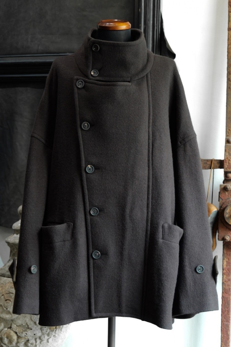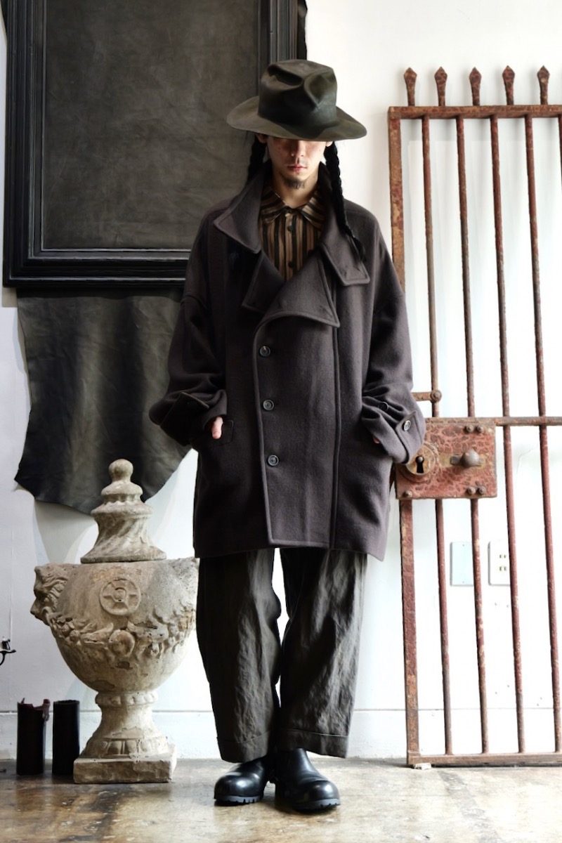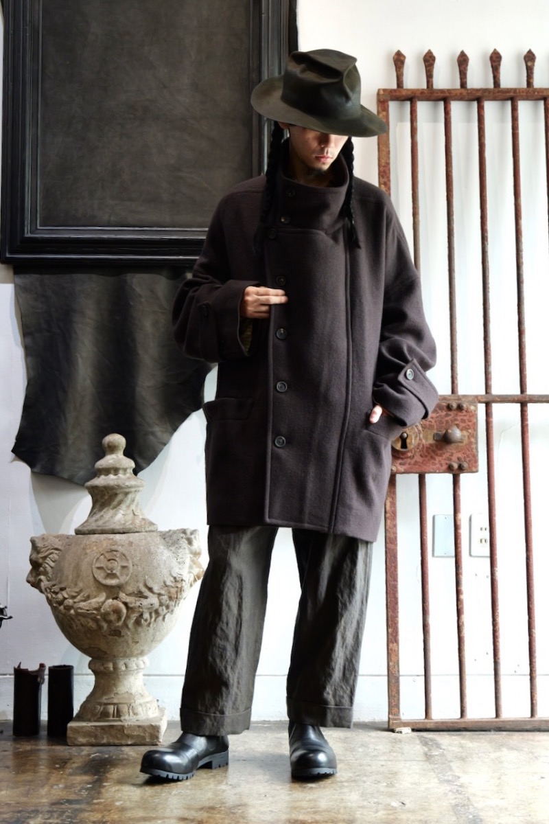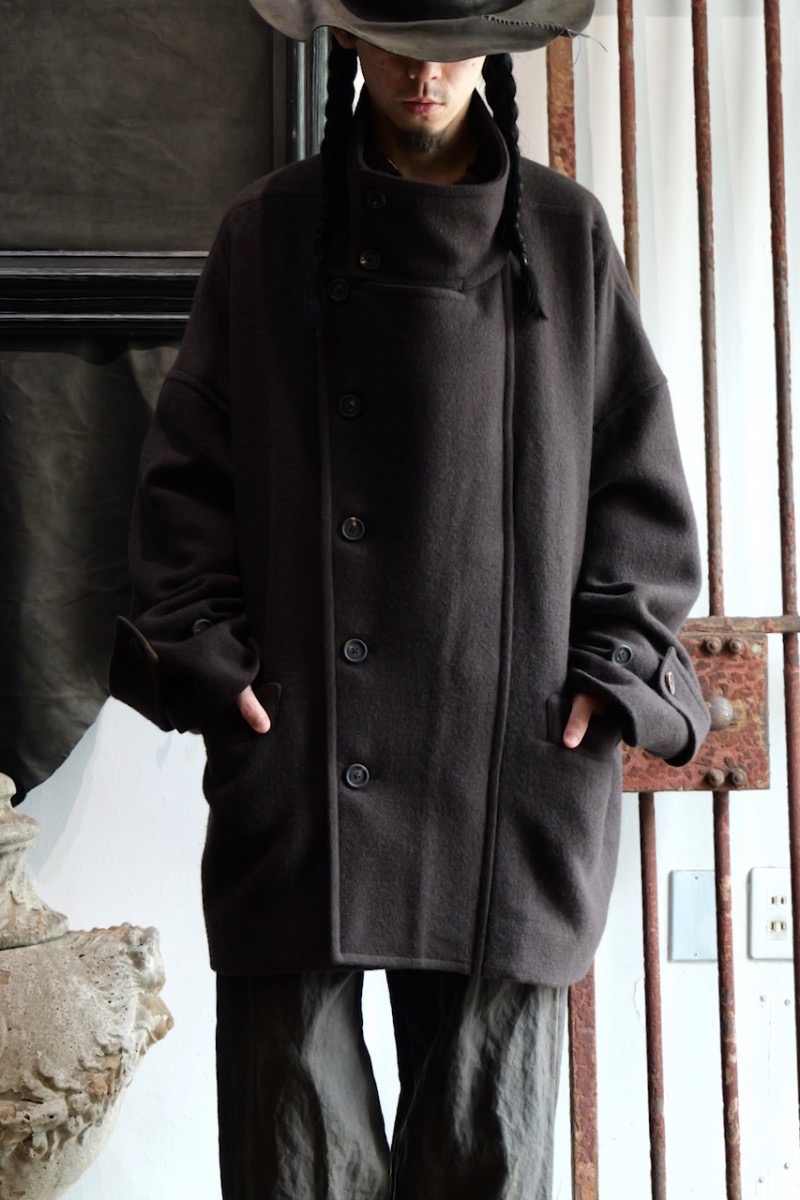 前を閉めた時と開けた時で全く印象が異なるコートでZIGGY CHENらしいデザインです。