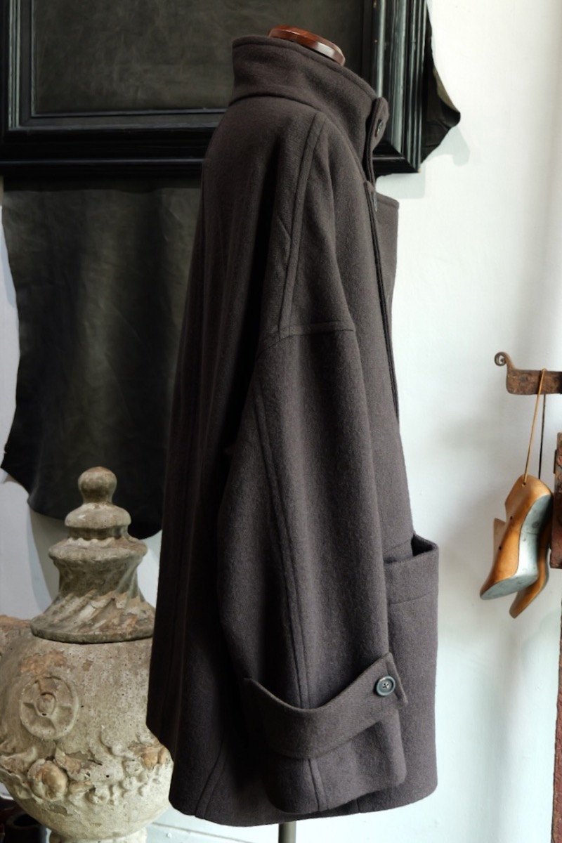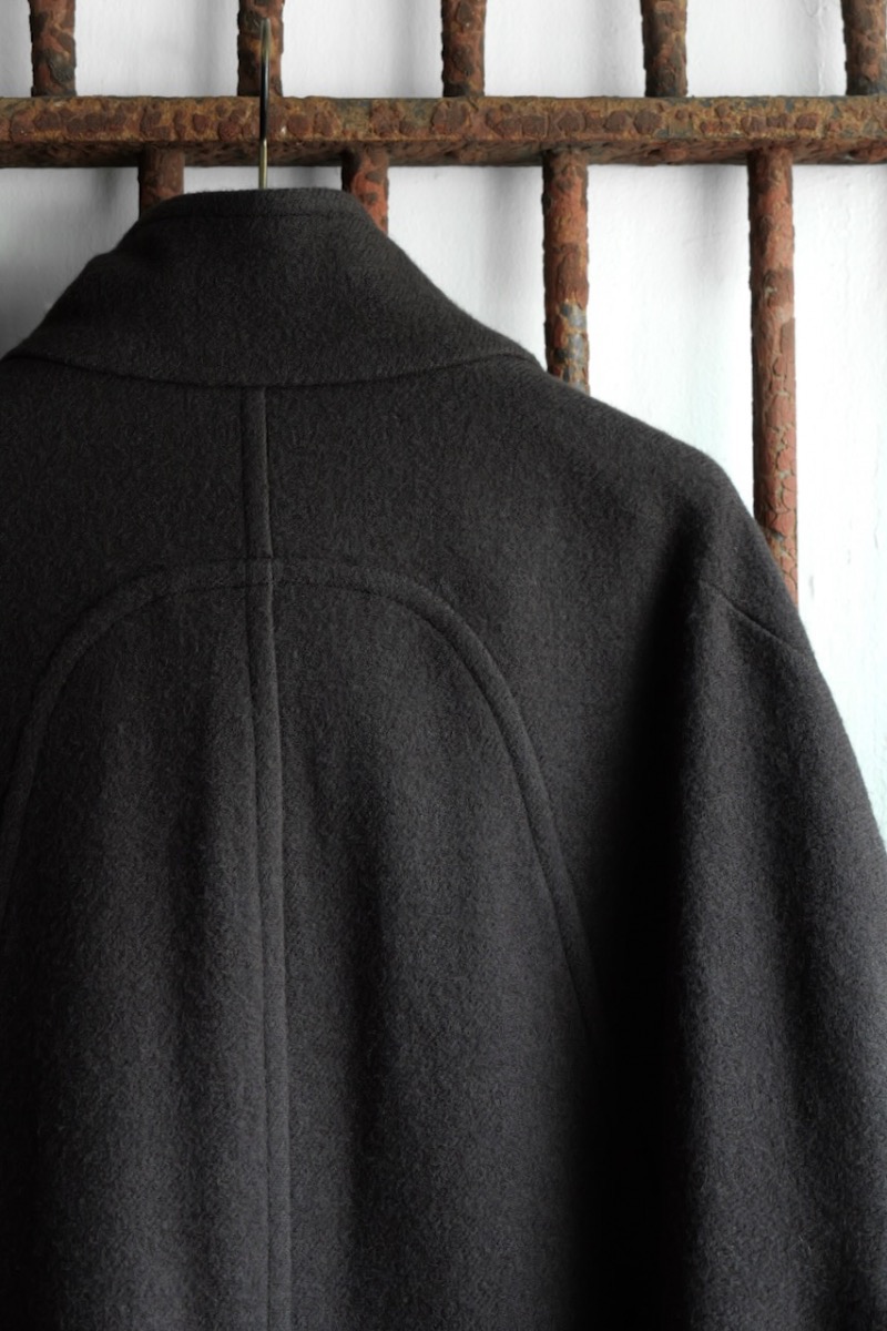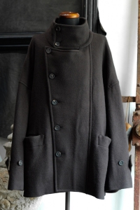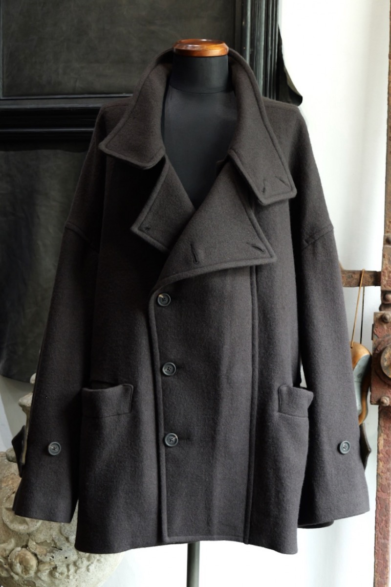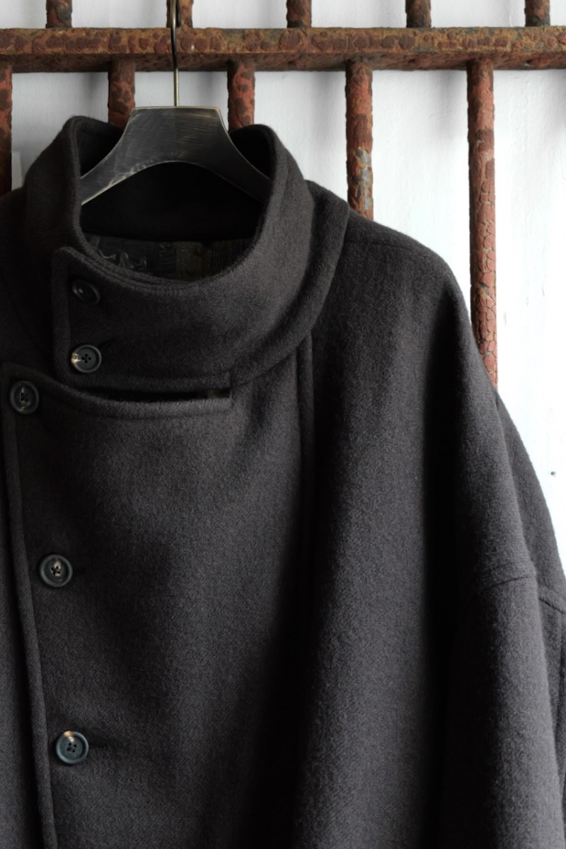 前を閉めた時と開けた時で全く印象が異なるコートでZIGGY CHENらしいデザインです。