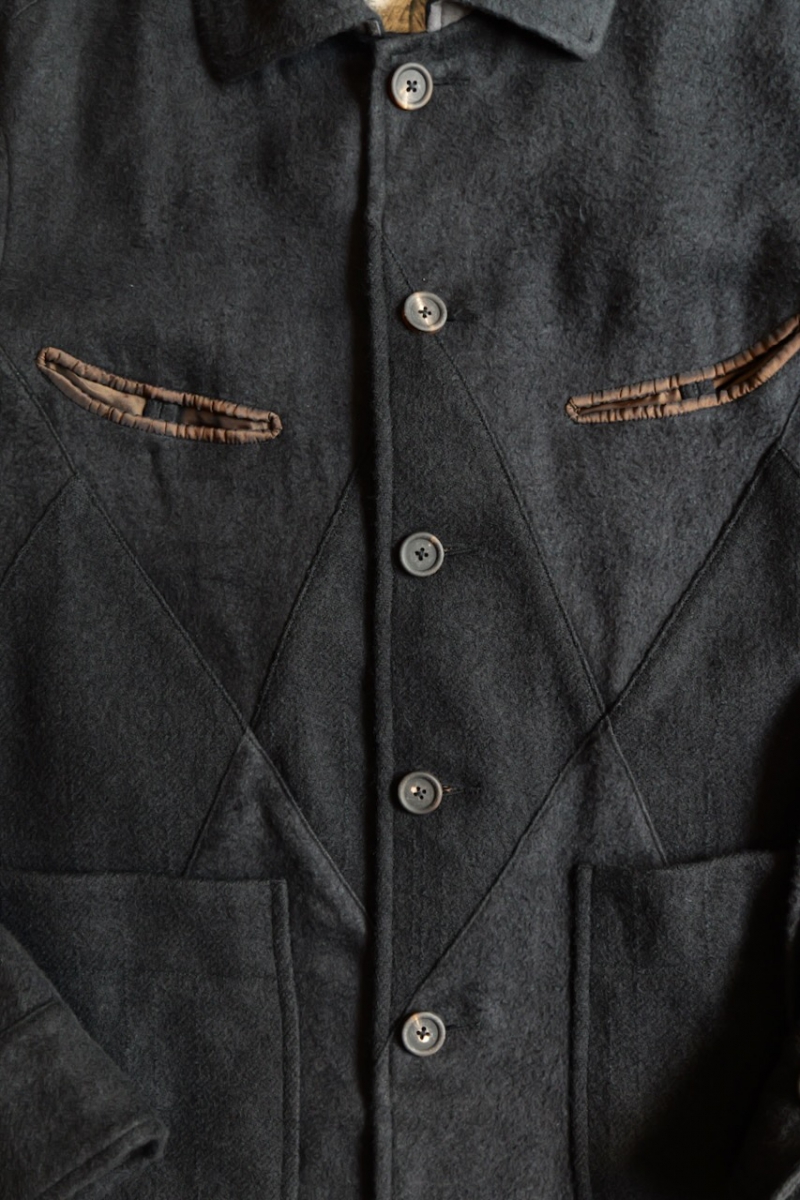 パッチワークの縫製はもちろん、カーブ形状で縫われた胸ポケットや襟裏のステッチワークも特徴です。
