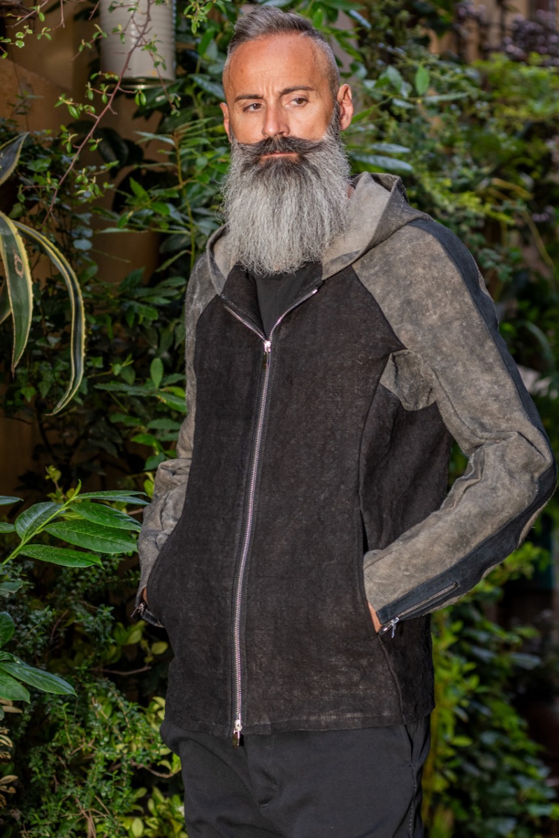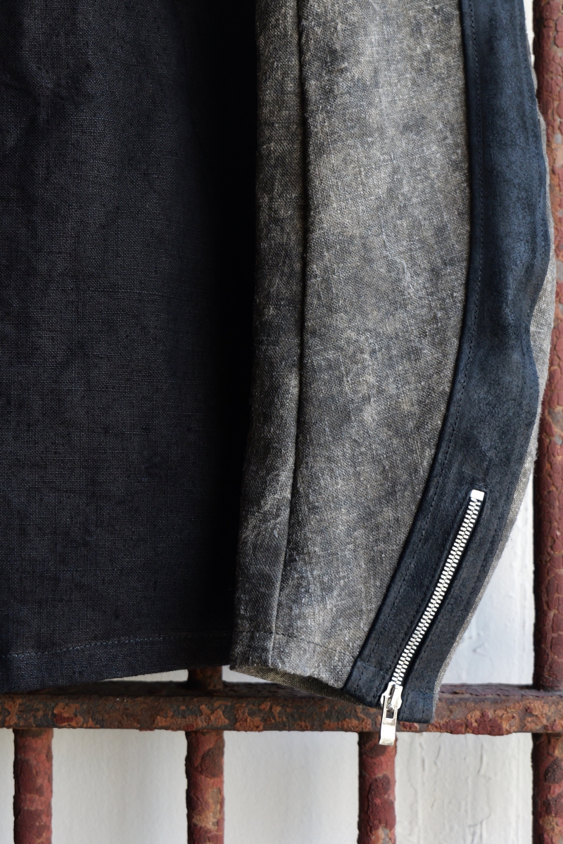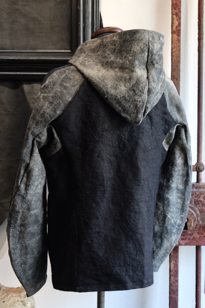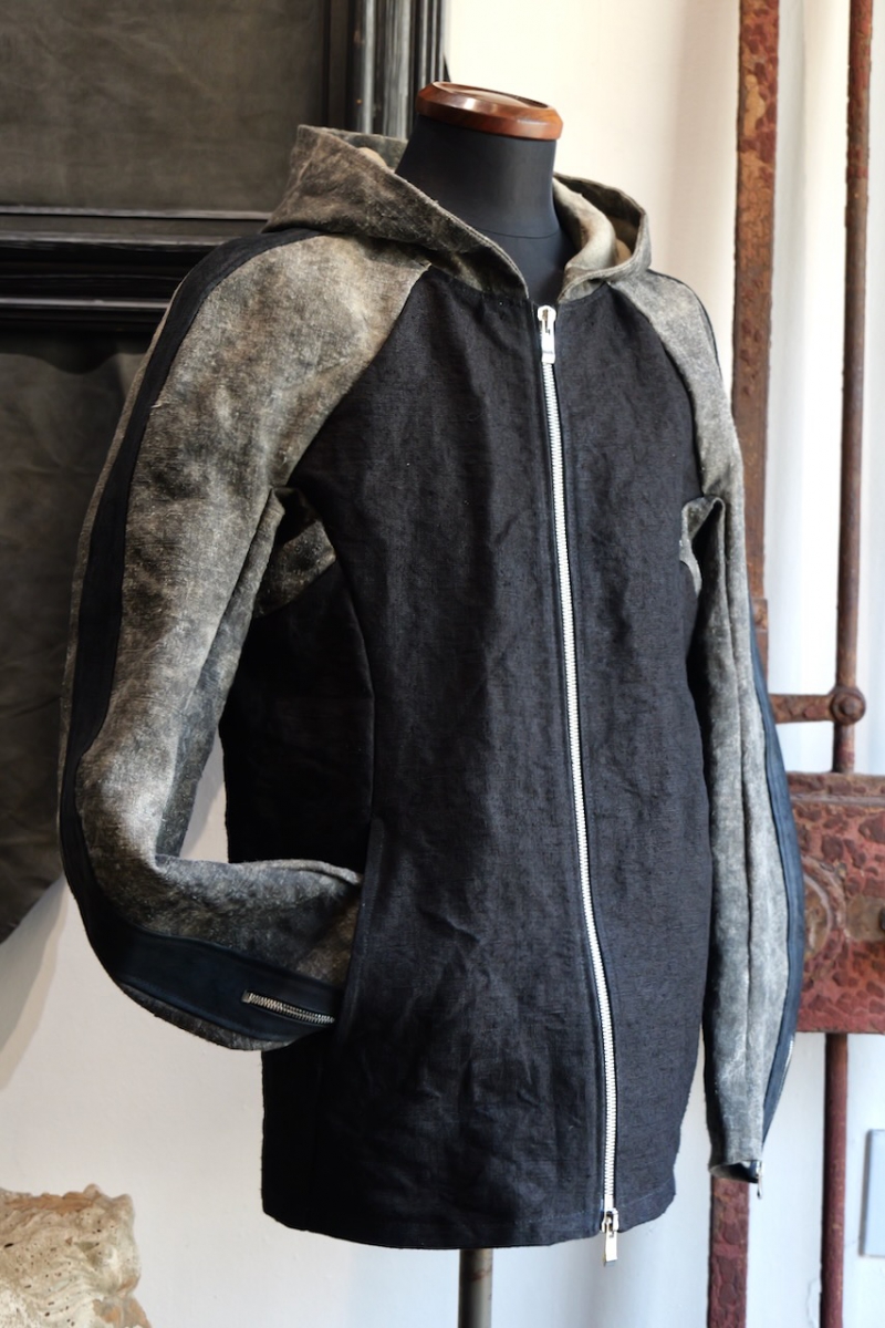 VINTAGE LINEN 100% + HORSE LEATHER ZIP FRONT HOODED BLOUSON 1/4 LINED SJ-3.
