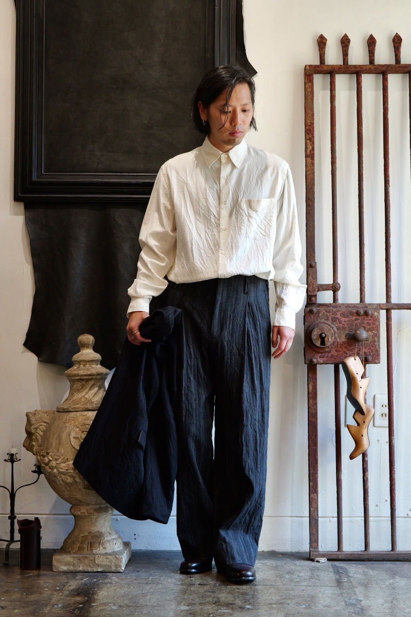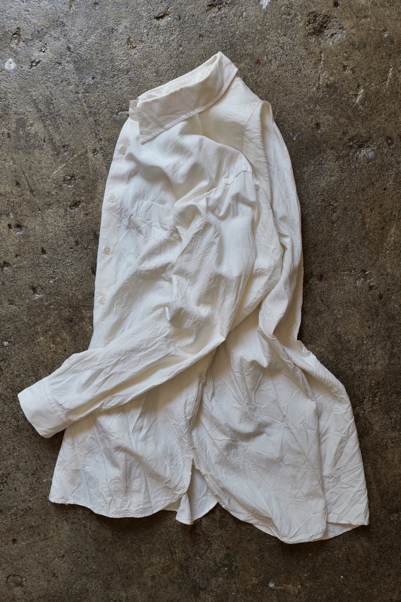 あえてシルク地に水洗い + 天日乾燥を施して素朴な表情に仕上げています。