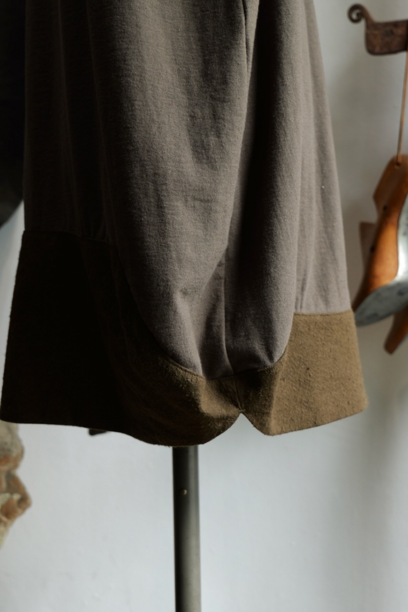 裾は異素材で切り替え、立体的なパターンで構成されています。