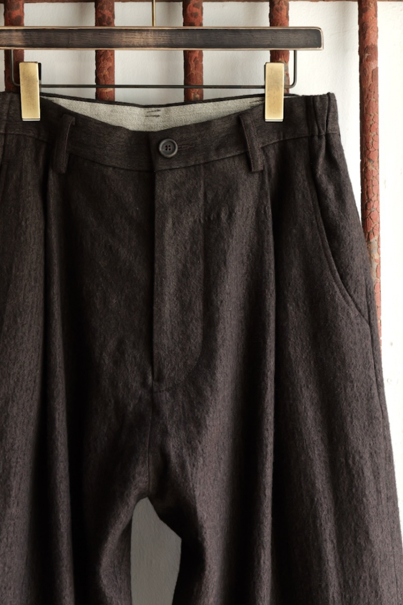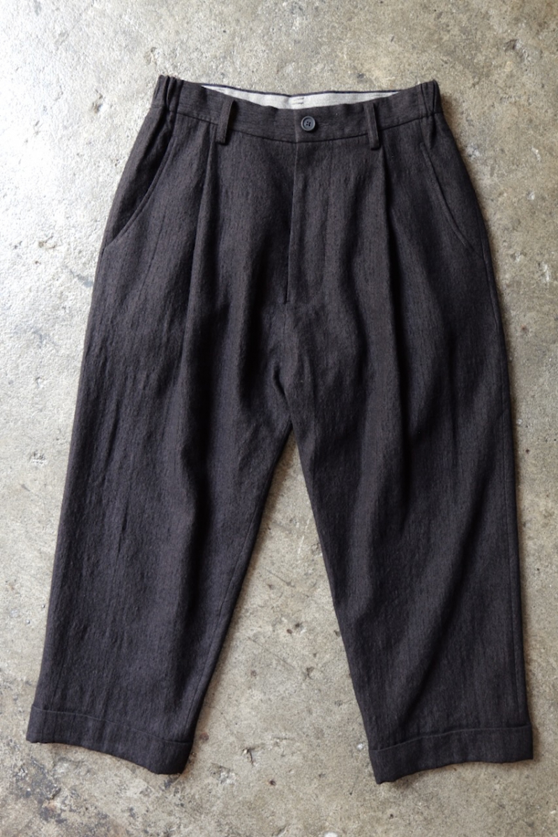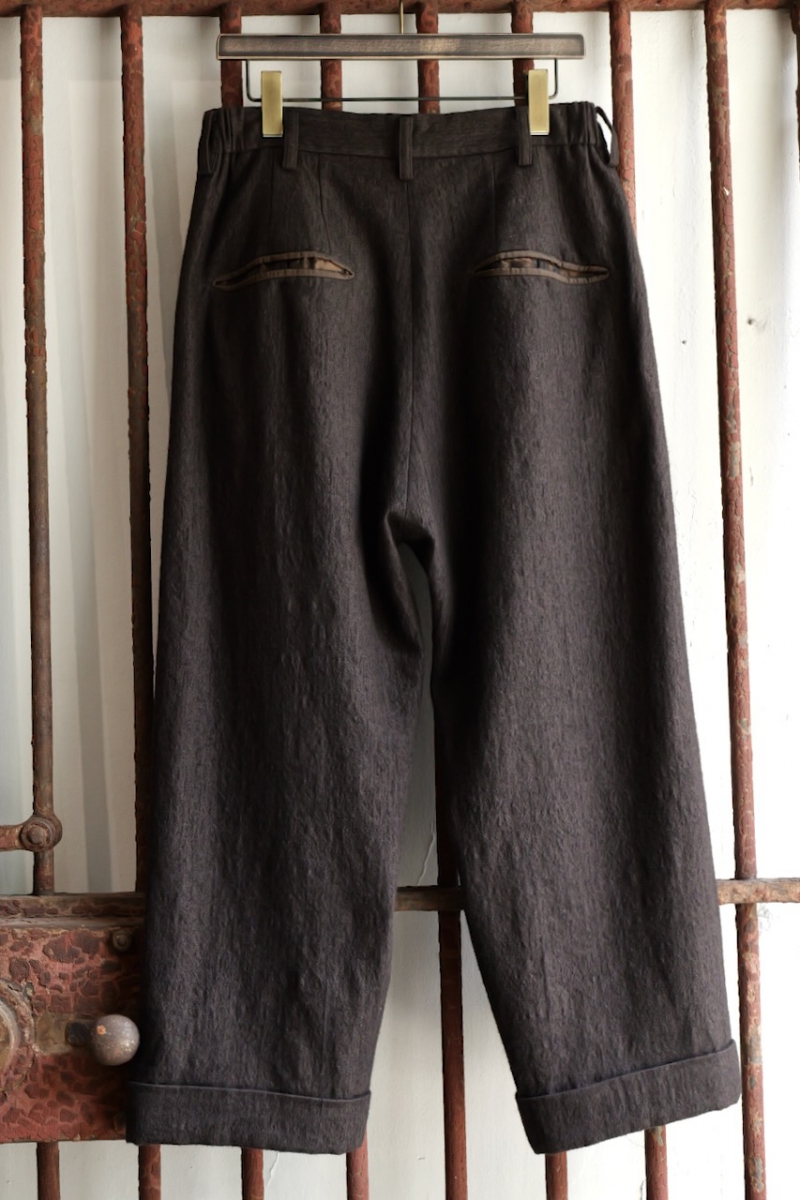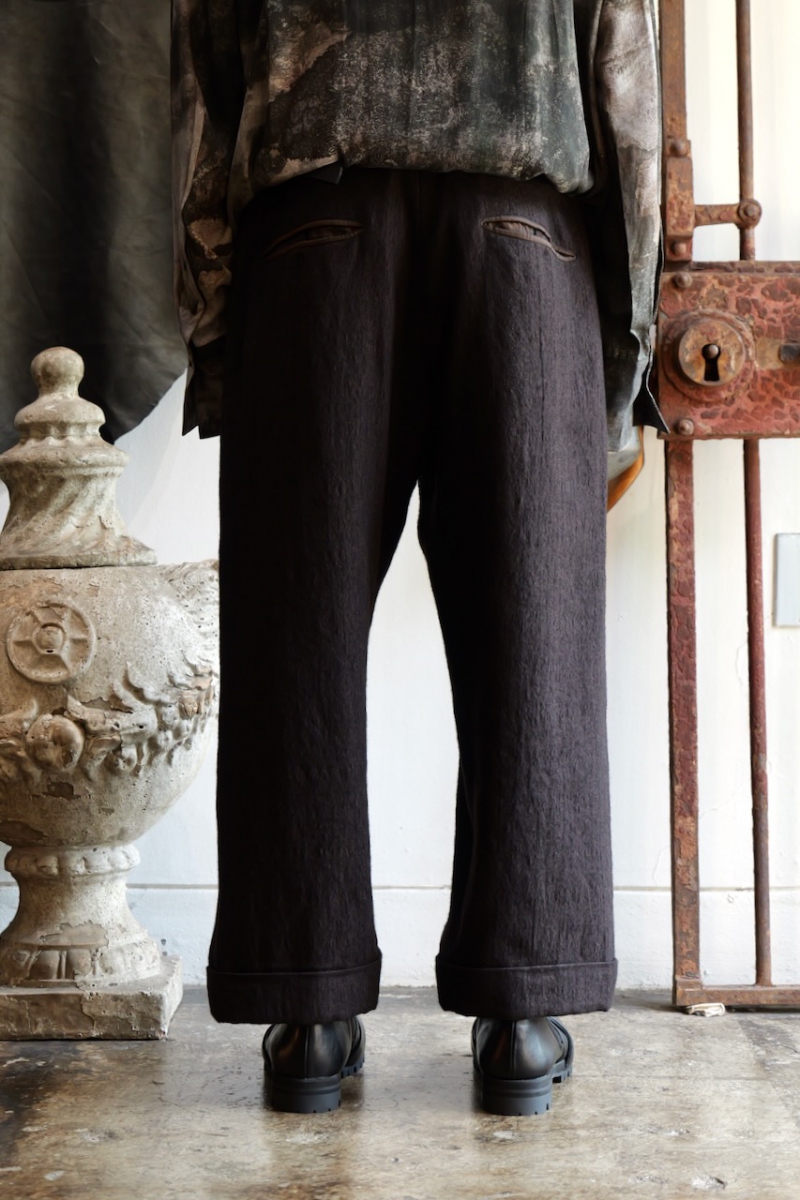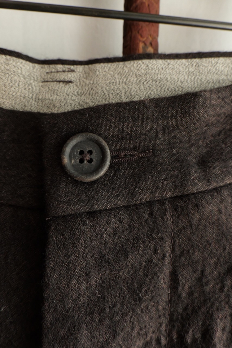 ・素材は平織りのリネンとウールの混紡素材で、ナチュラルな風合いと通気性のある構造を持っています。