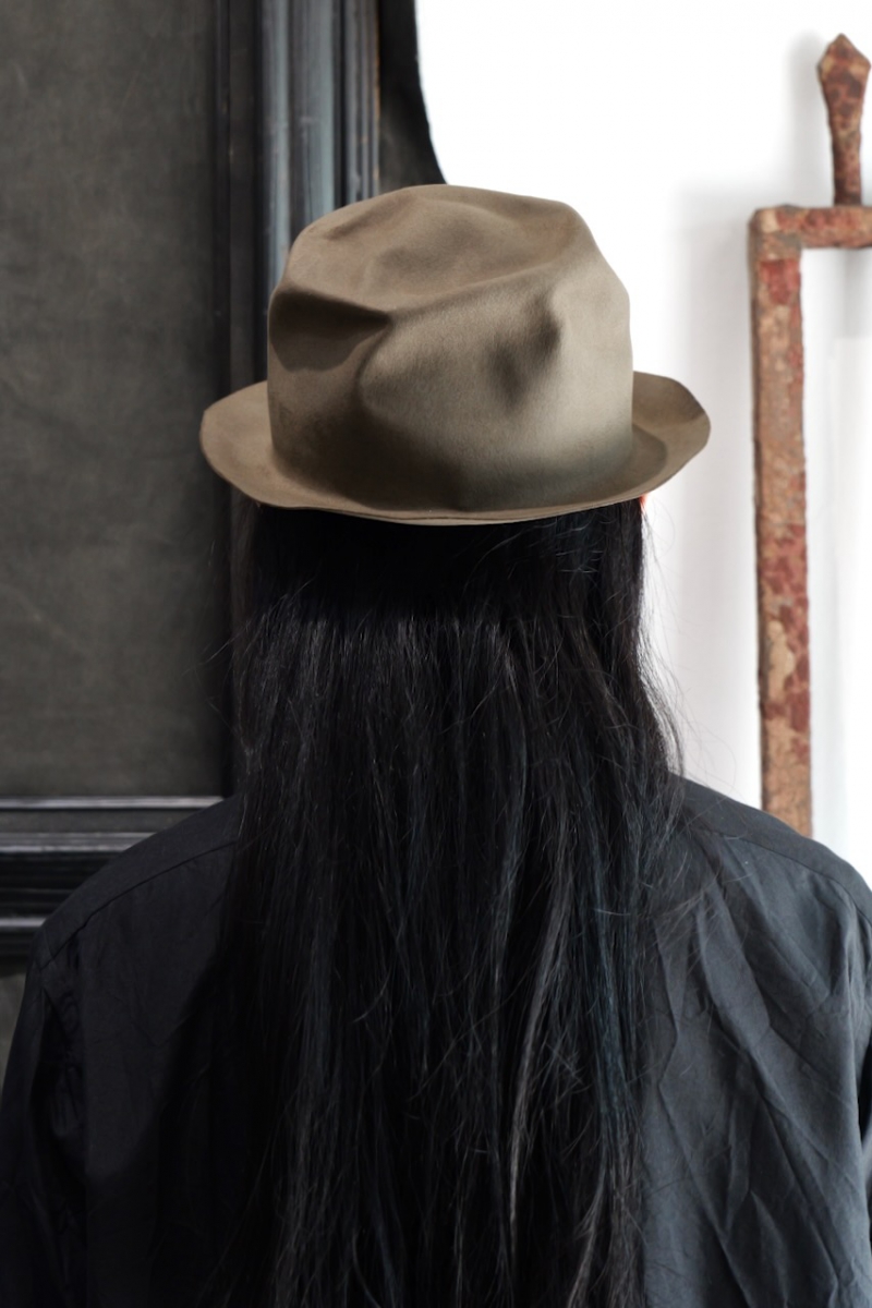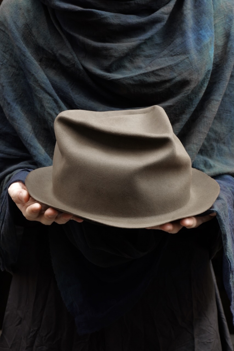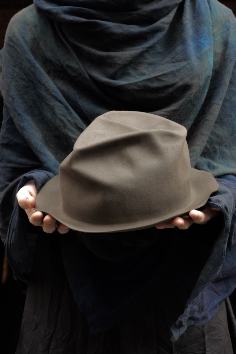 この作品は着用を重ねるうちに、自然に被る方の頭の形に馴染んでいきます。