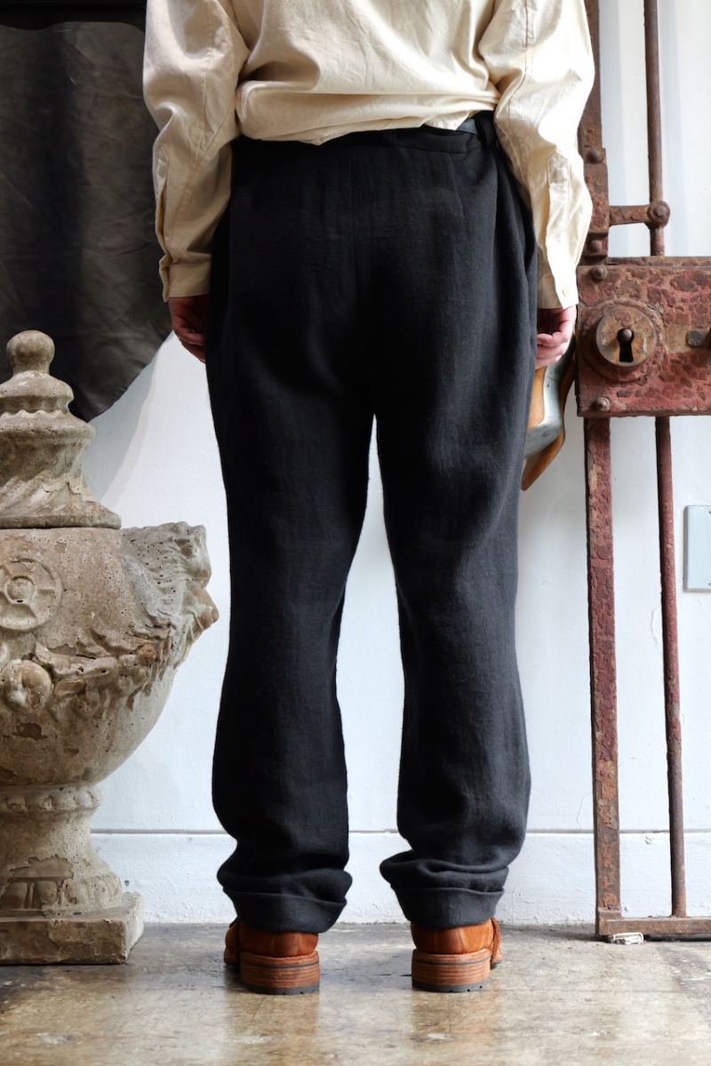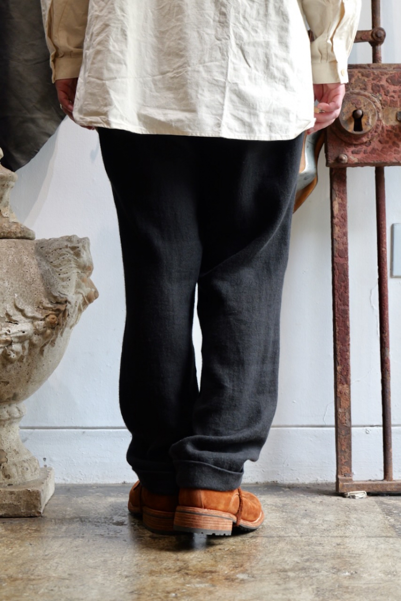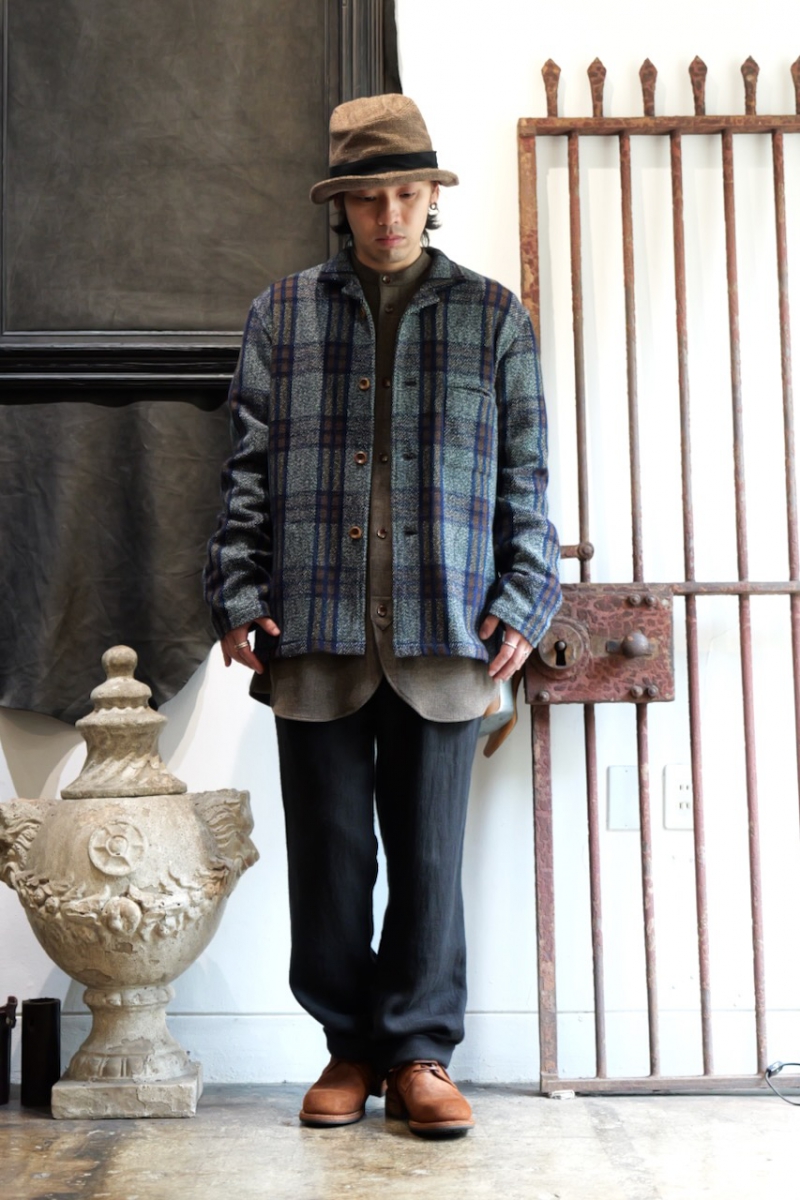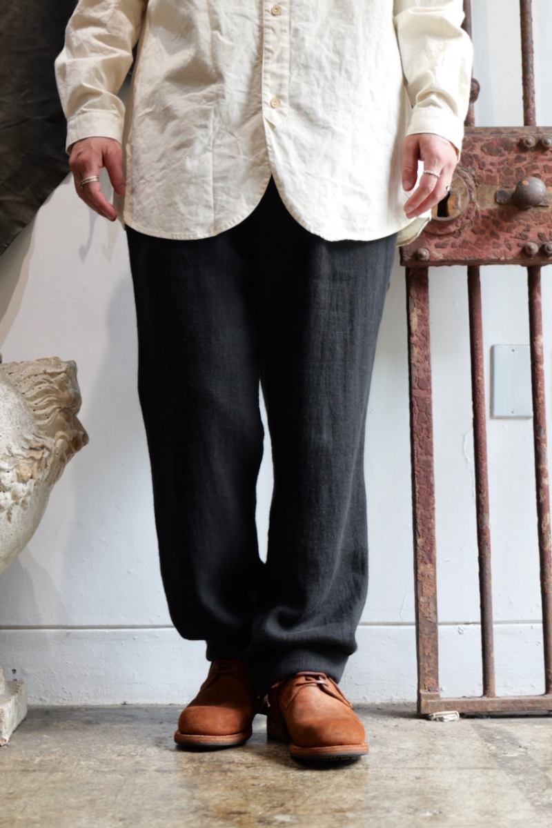 ・一瞬リネンかと思わせるこのウール100%生地は、洗いをかけることで少し起毛したような