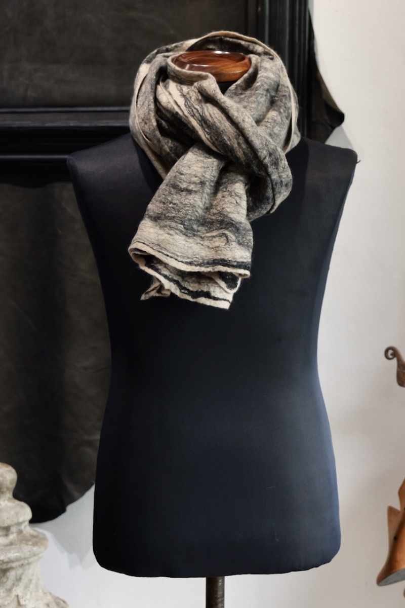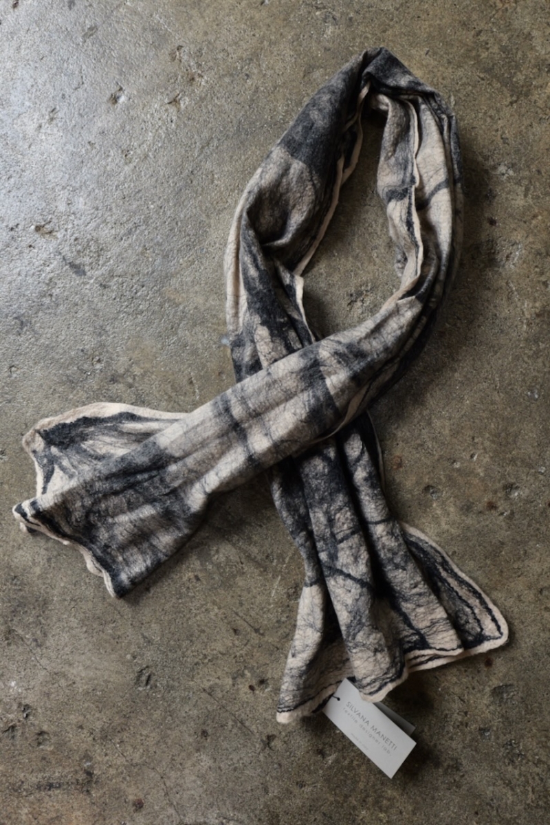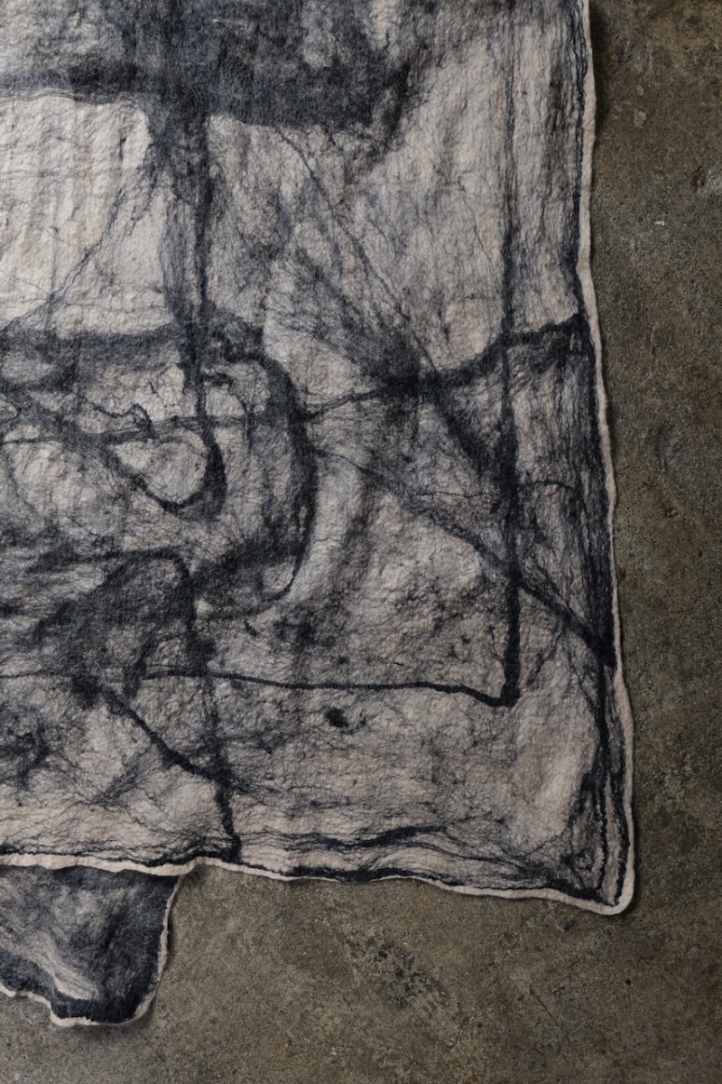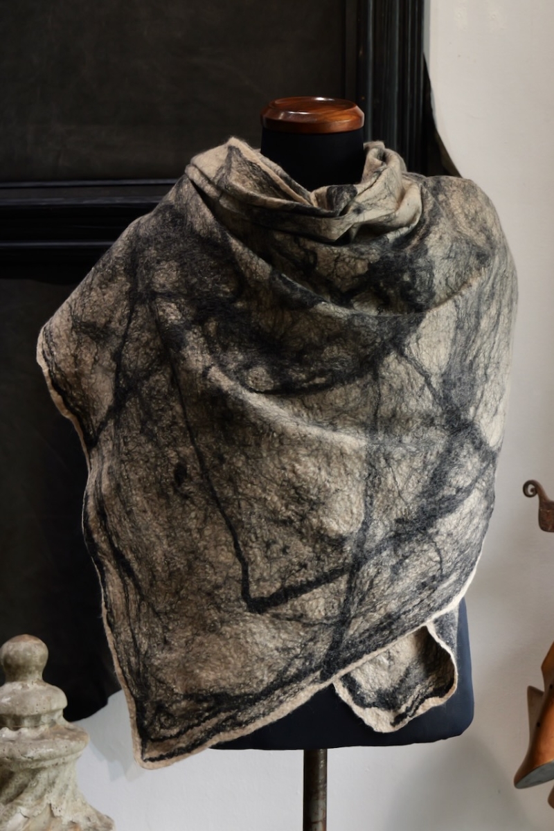 ・ウールシルクを使用し、ファイバーを何層にも重ね、それをハンドフェルトで定着させています。