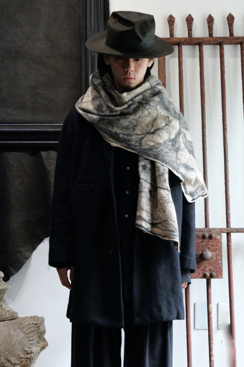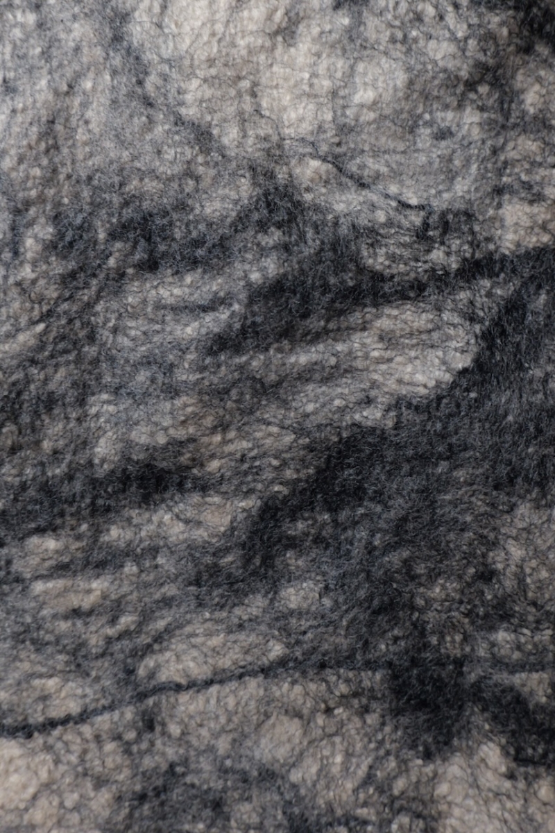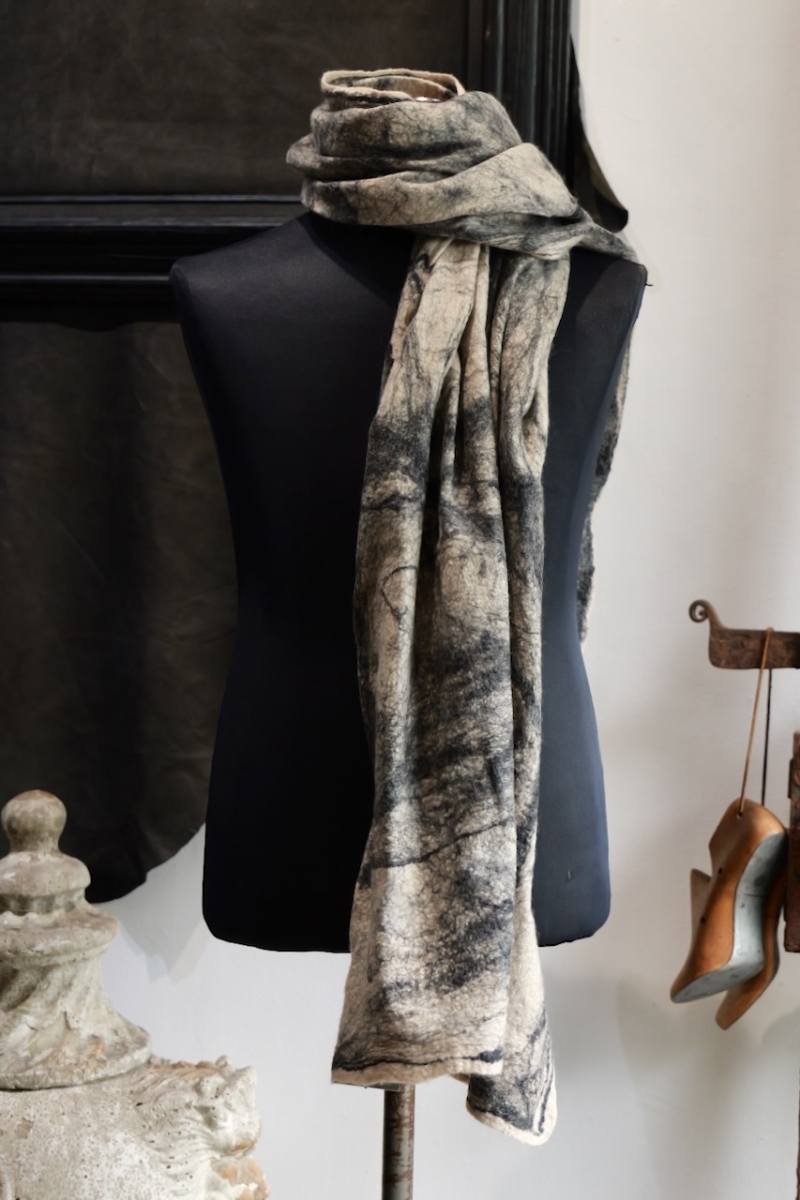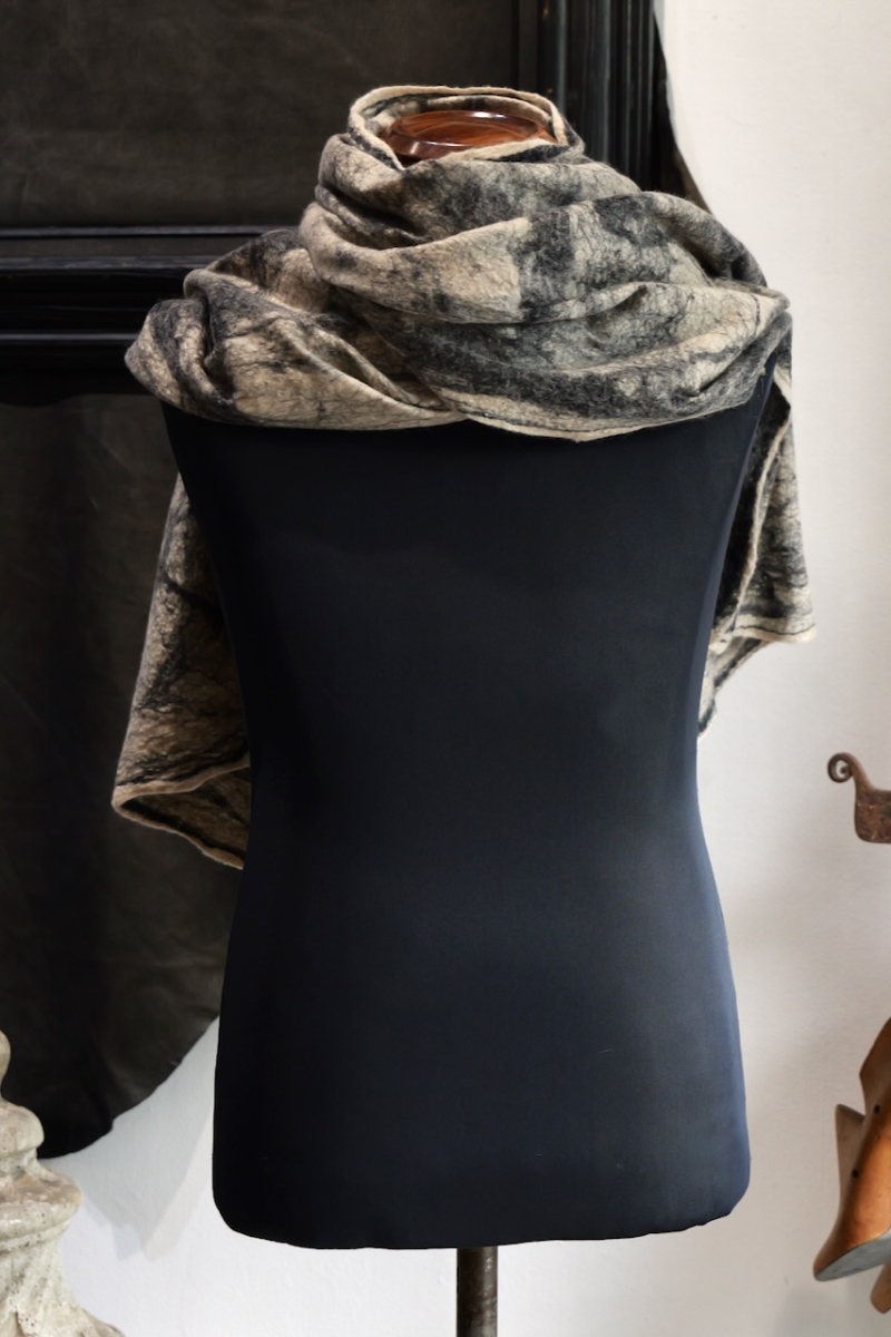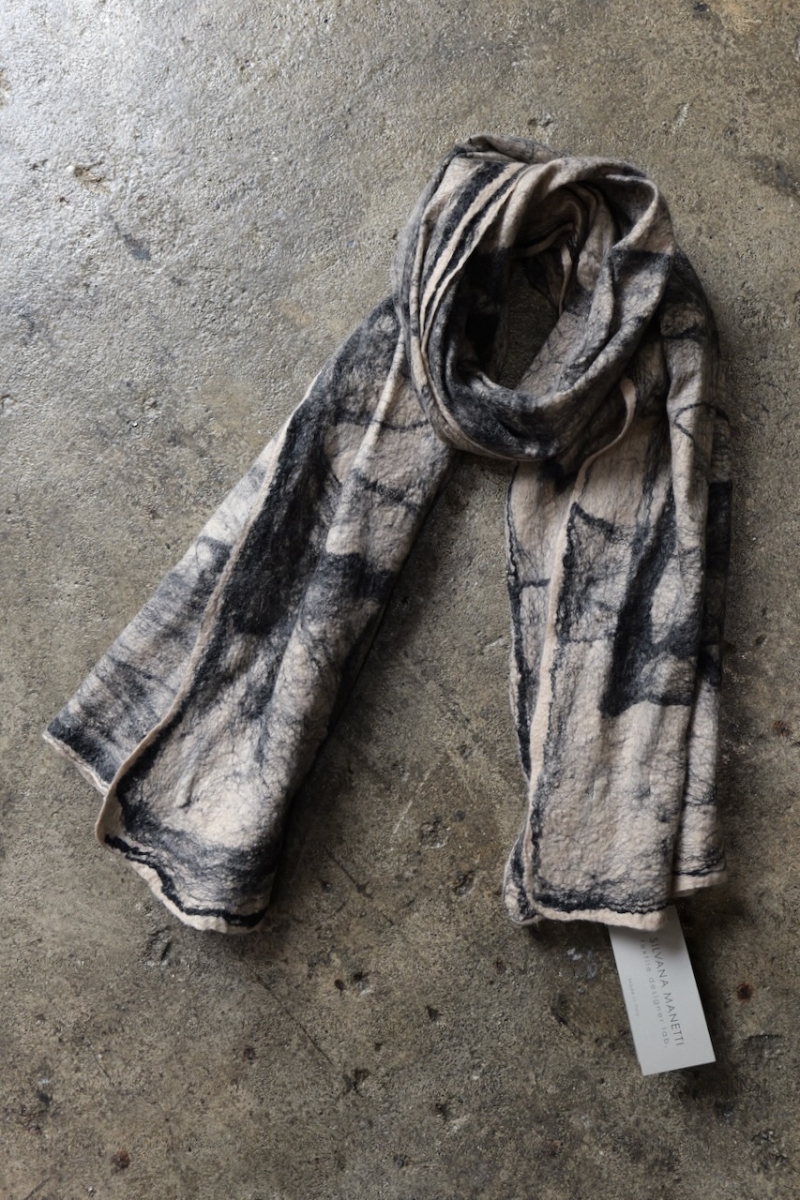 ・ウールシルクを使用し、ファイバーを何層にも重ね、それをハンドフェルトで定着させています。