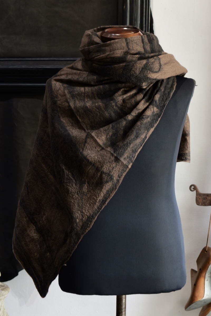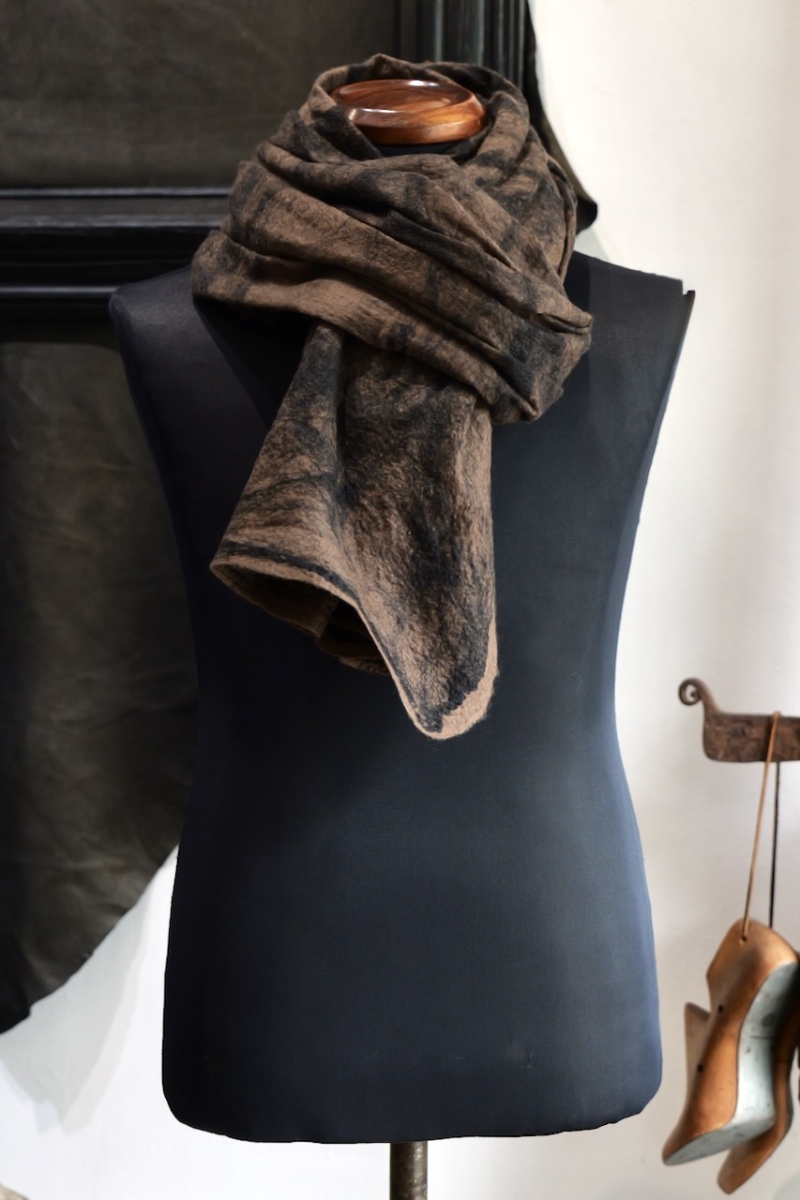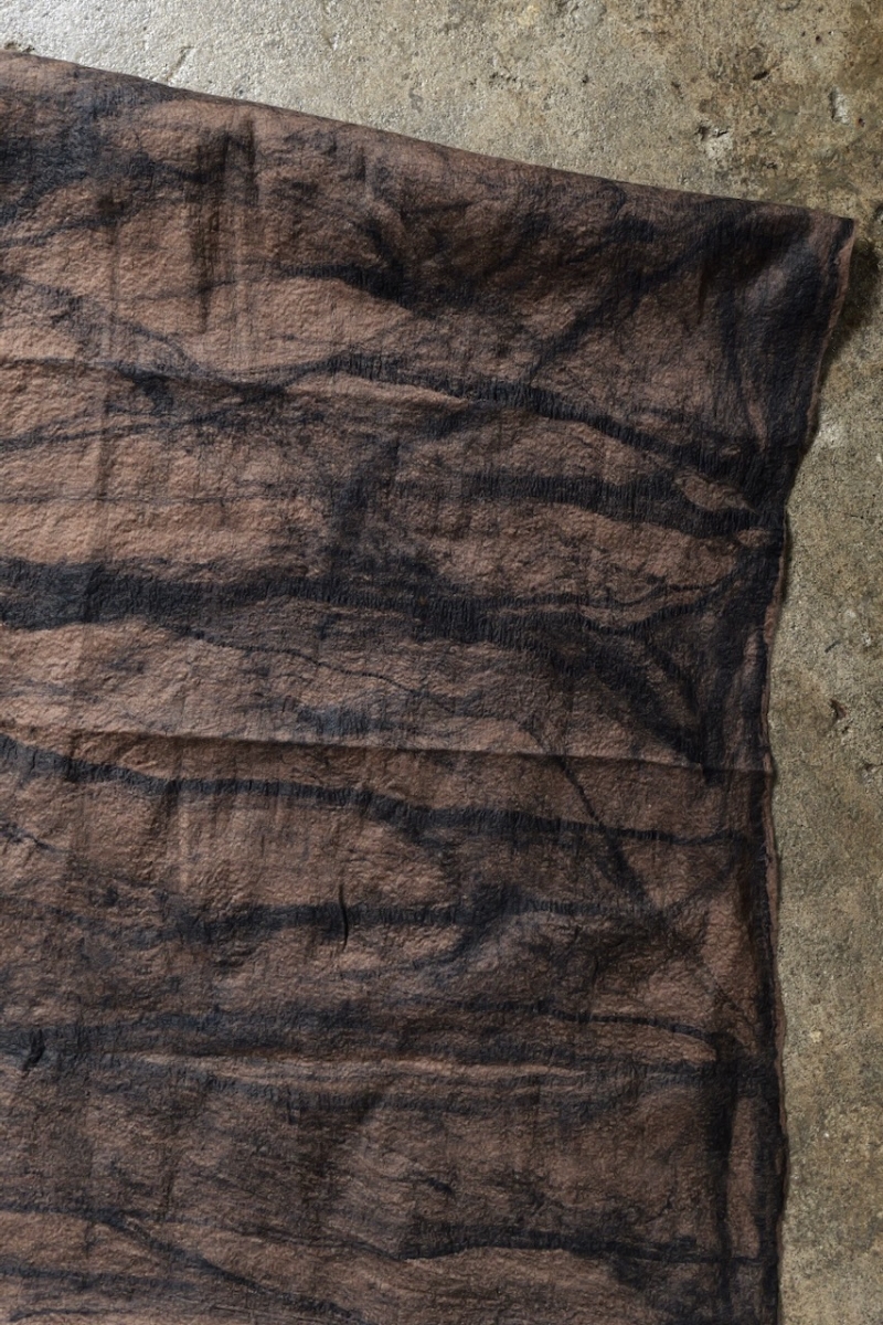 ・ウールシルクを使用し、ファイバーを何層にも重ね、それをハンドフェルトで定着させています。