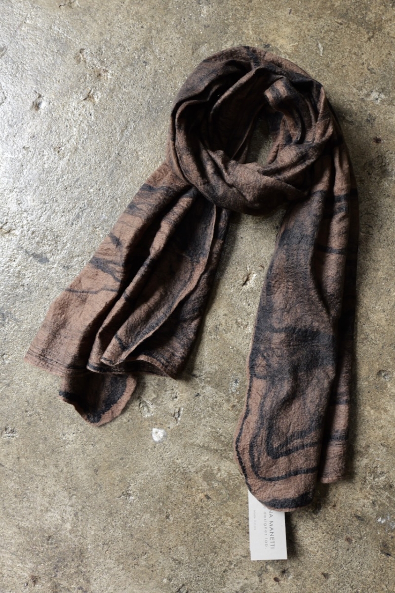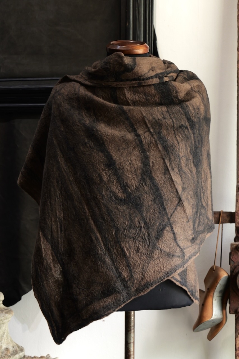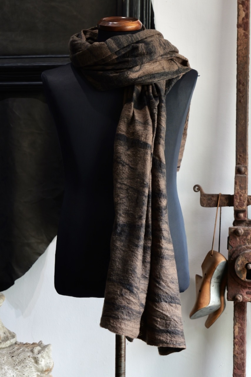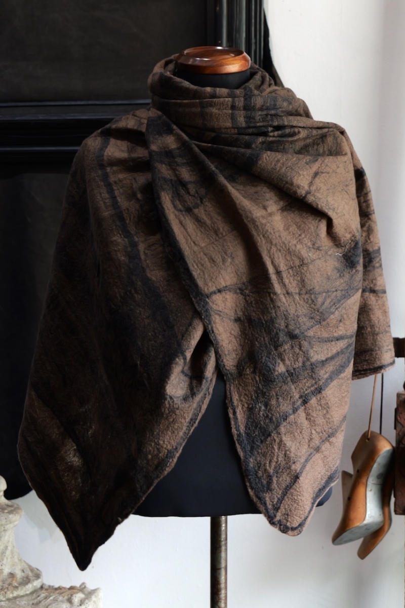 ・ウールシルクを使用し、ファイバーを何層にも重ね、それをハンドフェルトで定着させています。