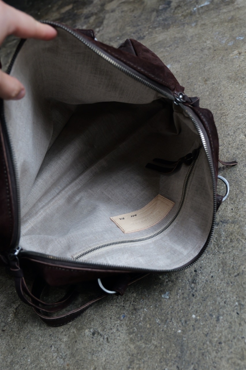 ・ライニングにはロウ引されたリネンを使用しており、中に入れたものの色移りを防ぐだけでなく、