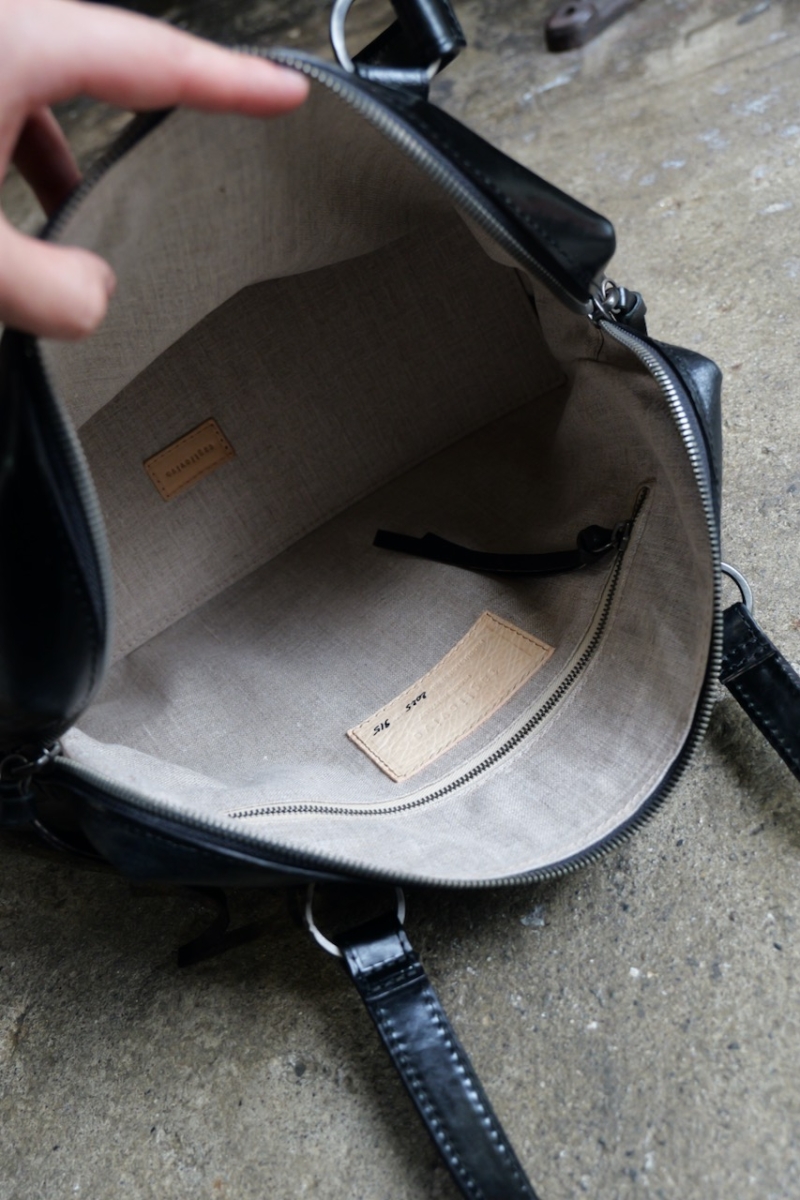 ・ライニングにはロウ引されたリネンを使用しており、中に入れたものの色移りを防ぐだけでなく、