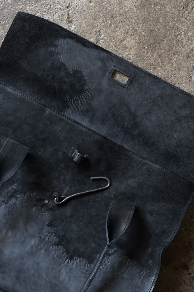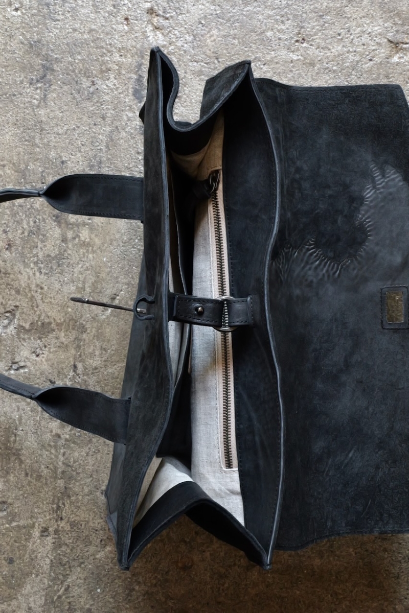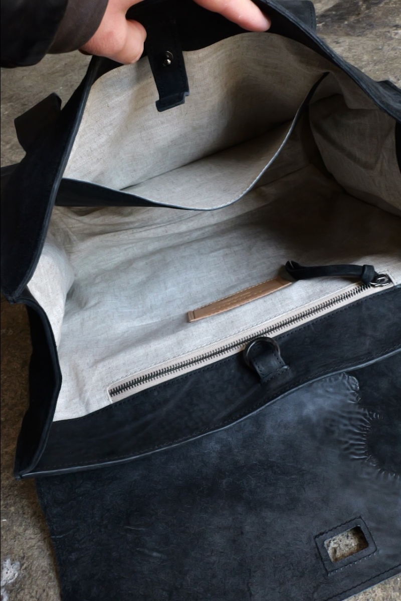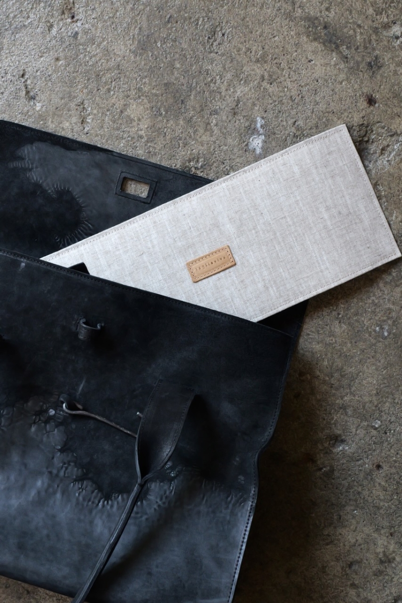 ・ライニングにはロウ引されたリネンを使用しており、中に入れたものの色移りを防ぐだけでなく、