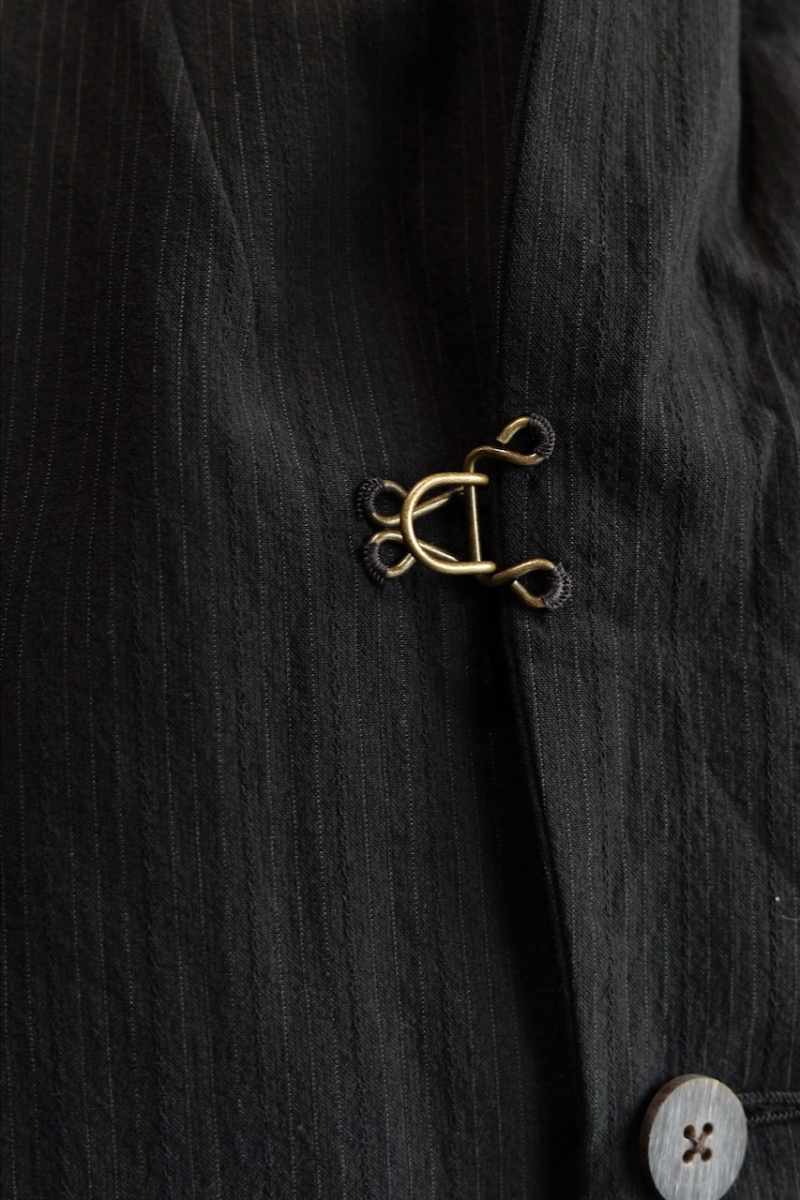 ボタン上にはオリジナルの真鍮性のカギホックがついているのでお好みで着方を変え変化を与えることができます。