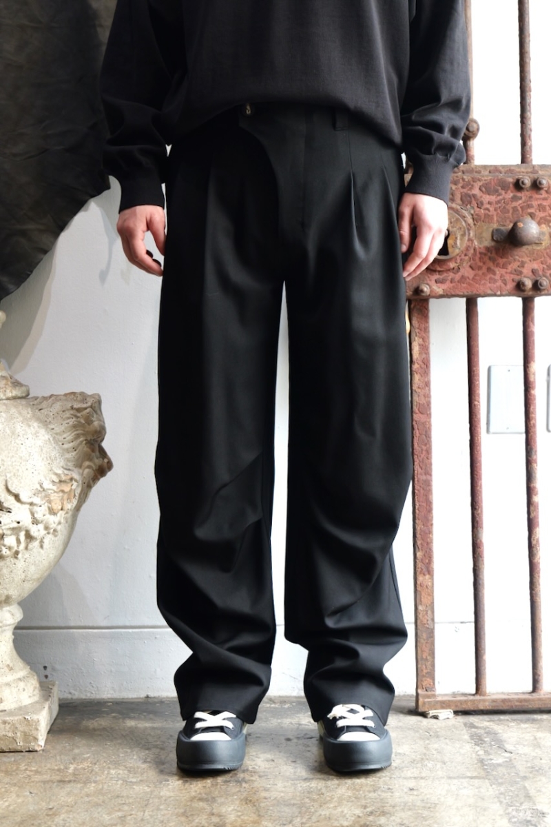 膝周りのタックと湾曲したシルエットが立体感とシワを作っています。