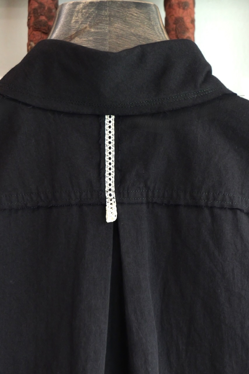 襟周りの処理、背を大きめに取ったパターン、肩線の引き方、ボタンの数や位置、