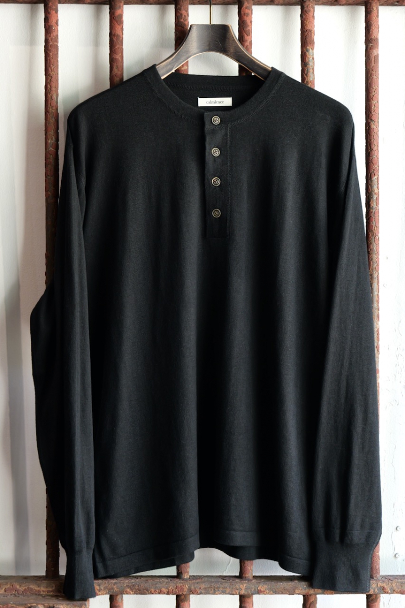 KNIT009. Henley Neck Long Sleeve T-Shirt High Gauge 3/60 Cashmere Silk. Black. Collection 005. calmlence.